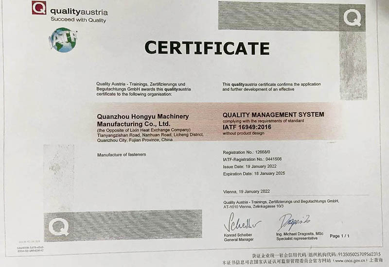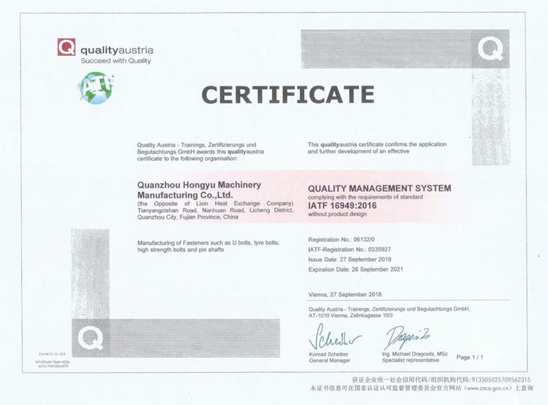 Quanzhou Hongyu Machinery Manufacturing Co.,Ltd. is located in the attractive city of China-Quanzhou.Specializing in the production of a variety of domestic and imported auto parts and engineering machinery accessories.The main products are U-shaped bolts,wheel bolts,locking bolts,high strength bolts,nuts and other products.